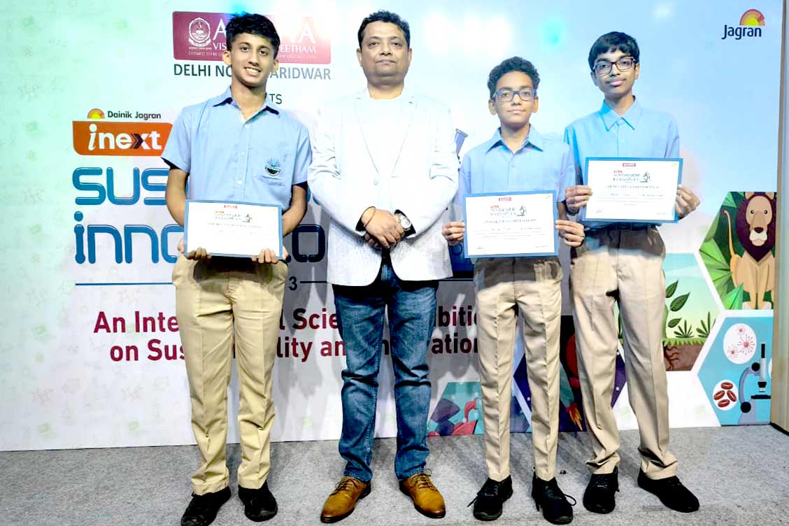 It was a proud moment for The Khaitan School, Noida, as its bright innovators — Pranay Gupta (Class XI-D), Aditya Dutta (Class X-C), and Aryan Gupta (Class X-B) — secured the Second Position in the Amrita Vishwa Vidyapeetham Sustainable Developer Award organized by Dainik Jagran on 8th October 2025.